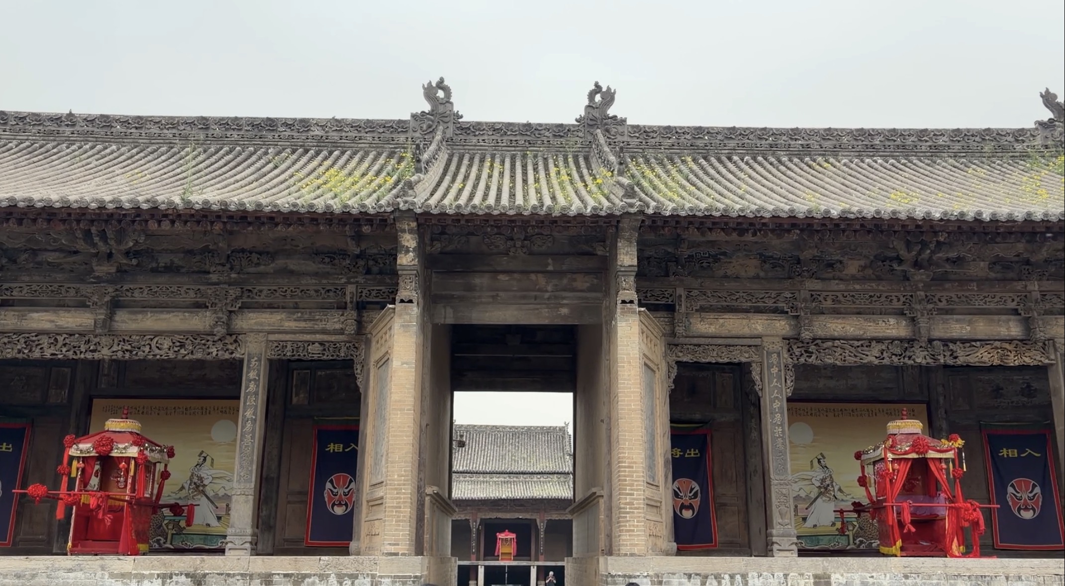 “位于山门后的舞台叫过亭台或过路戏台。庙会时,中门大开,上面唱戏,下面过人。”随着陈晓艳指引,能看到戏台上的对联写着“游哉悠哉,头上生旦净丑;演也艳也,脚下士农工商”,这也是当时唱戏时的生动反映。再加上两座屋顶相连的戏台,一庙三台,呈品字形分布。
