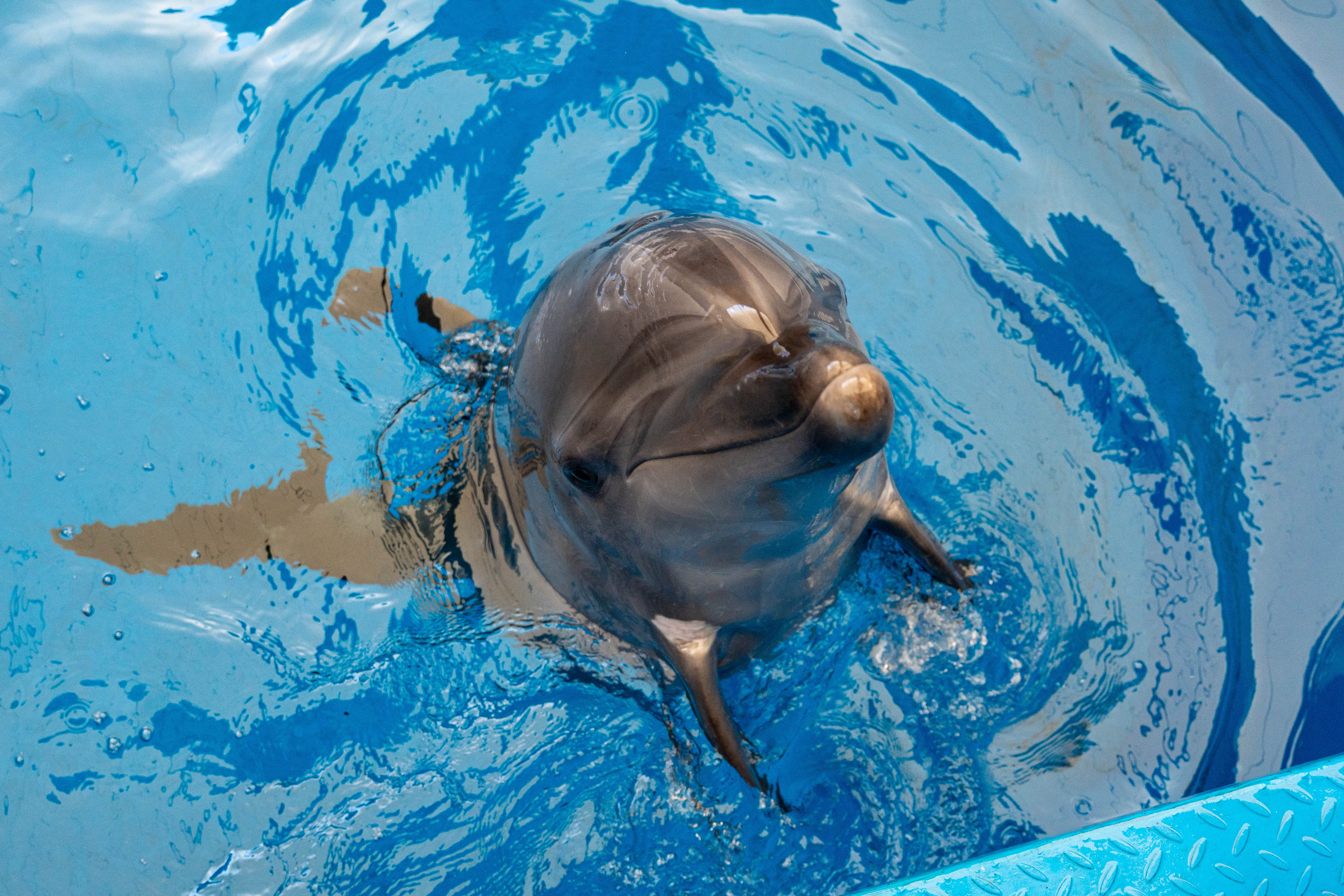 它的下颚稍长,被保育员们亲昵地叫“地包天”,但这丝毫不影响它的颜值,反而成了极具辨识度的标志。一身光滑流畅的黑灰色“高定皮肤”,配上灰白色的腹部,游动起来好看极了。性格活泼,聪明伶俐,社交能力MAX,是保育员眼中的“三好学生”。